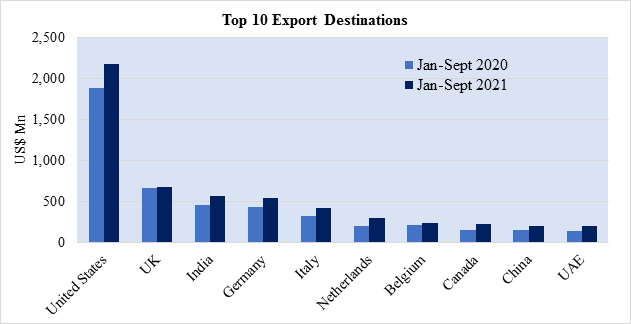Moreover, Exports to India and Pakistan increased by 24.97% and 27.66% y-o-y to US$ 566.94 Mn and US$ 68.49 Mn respectively during the first nine months of 2021.  Increased Exports to India is mainly supported by increased exports of Woven fabrics (194.92%) and Bicycles Not Motorized (276.31%) in the first nine months of 2021.