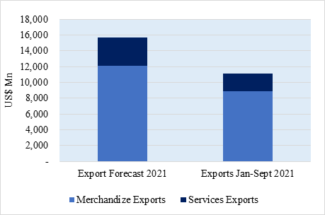 The revised export target of the Export Development Board for 2021 is US$ 15.72 billion and of that we expect US$ 12.14 billion from merchandise exports and US$ 3.58 billion from services exports. During the period January to September 2021, earnings from exports recorded US$ 11.1 billion including the estimated services data for July to September and 70.63% achieved from the revised export target.