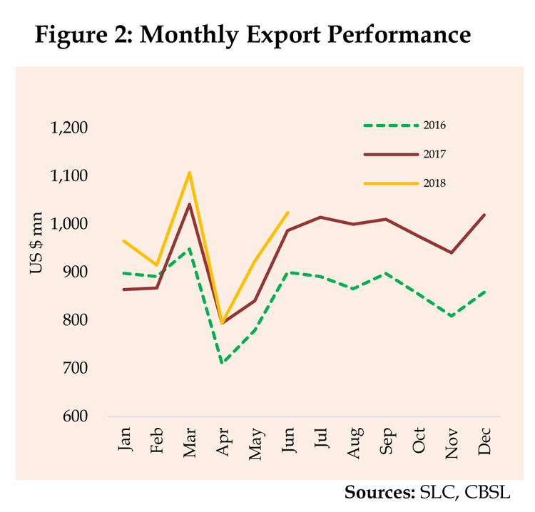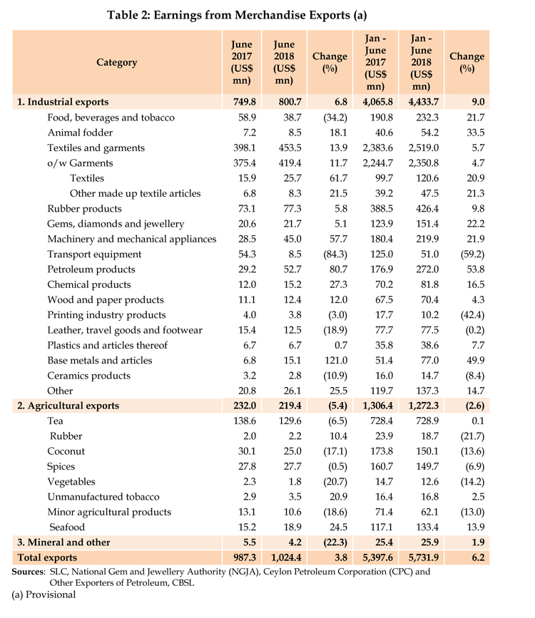 Earnings from merchandise exports surpassed US dollars 1 billion for the second time during the year to US dollars 1,024 million in June 2018, mainly driven by industrial exports. Under industrial exports, earnings from textiles and garment exports increased significantly due to the higher demand from the EU and the USA while exports to nontraditional markets also increased.