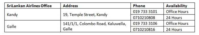 Accordingly, ticketing related matters can be taken care of by SriLankan Airlines offices in Kandy and Galle, and passenger services agency offices in Batticaloa, Gampaha, Hambantota, Jaffna, Kurunegala, Vavuniya and Wennappuwa.