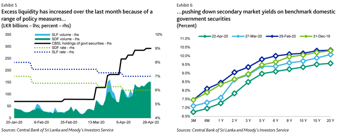 CBSL has undertaken significant liquidity injections, while foreign exchange reserves have declined by around $400 million over the course of March due to external repayments. A LKR24 billion ($123.4 million) profit transfer from CBSL to the Treasury and increased CBSL holdings of government securities have further increased systemwide liquidity (see Exhibit 5). CBSL's measures have resulted in a downward shift in the domestic yield curve (see Exhibit 6).