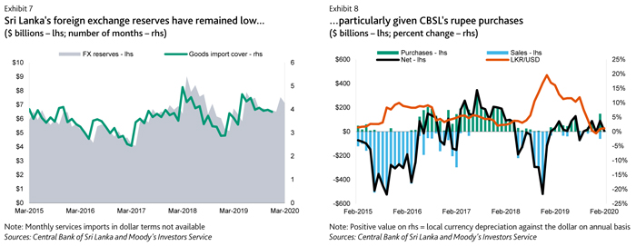 Weaker foreign exchange inflows will constrain monetary policy flexibility and effectiveness. As of March 2020, foreign exchange reserves stood at $7.1 billion, slightly less than four months of goods imports cover (see Exhibit 7). CBSL's net purchases of foreign exchange from the market in 2019 only temporarily offset weakness in non-debt-creating foreign exchange inflows (see Exhibit 8).