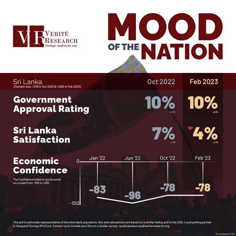 Another round of the Gallup Style “Mood of the Nation” poll was conducted in early February 2023 by Verité Research. It assessed the approval, satisfaction, and confidence of the nation in relation to the government, the country, and the economy.