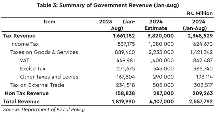 The Sri Lankan government has reported a significant rise in revenue for the first eight months of 2024, with total government revenue, including grants, increasing by 40.5%. This growth amounted to Rs. 2,565.9 billion, a sharp increase from Rs. 1,826.6 billion collected during the same period in 2023. The rise was largely driven by a strong performance in tax revenue, which surged by 41.4%, reaching Rs. 2,348.5 billion.