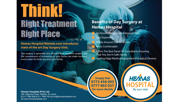 Pioneer in innovative and affordable healthcare solutions & the giant in private healthcare out of Colombo, Hemas Hospital Wattala has introduced a new dimension in surgery while offering a range of specially designed Day Surgical Packages to ensure convenience, better affordability & best patient experience for the masses. Day surgery is a relatively new concept to Sri Lanka and Hemas Hospital Wattala takes pride in being the first hospital out of Colombo to avail these new solutions to needy patients.
