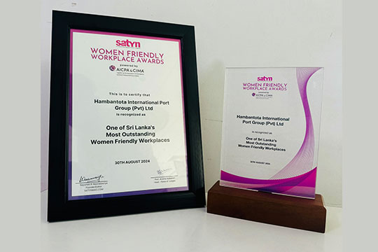 The Hambantota International Port Group (HIP) was honoured as one of Sri Lanka’s most outstanding Women Friendly Workplaces at the Women Friendly Workplace Awards 2024. The Women Friendly Workplace Awards, organised by leading women's magazine Satyn in collaboration with AICPA & CIMA, recognized more than 30 companies across various industries for their efforts in promoting gender equality in the workplace.