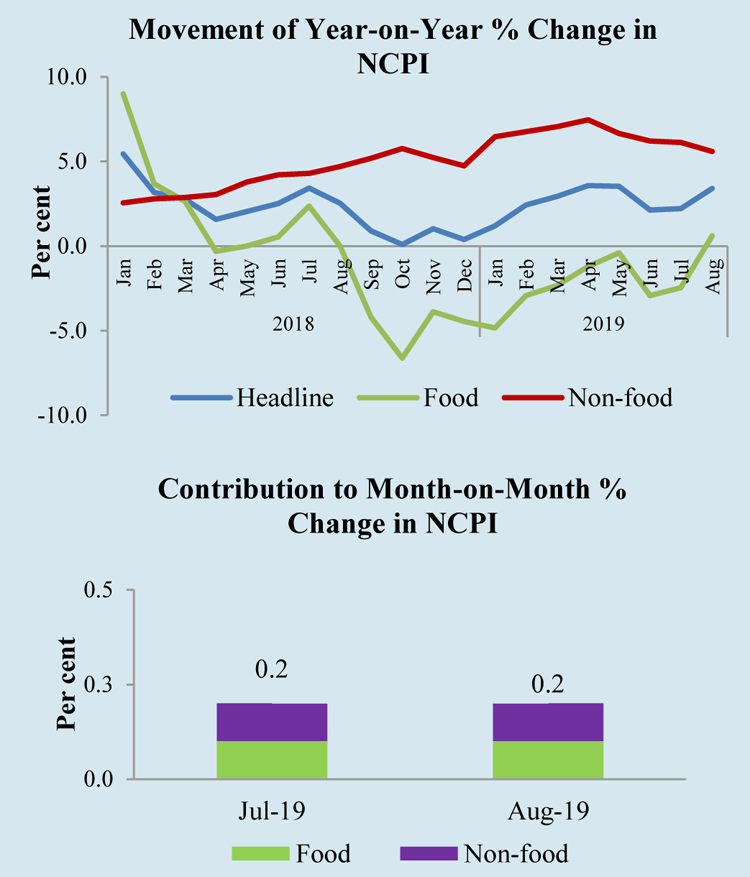 Headline inflation as measured by the year-on-year change in the National Consumer Price Index (NCPI, 2013=100)  increased to 3.4 per cent in August 2019 from 2.2 per cent in July 2019. The low base that prevailed in the corresponding month of the previous year and the monthly increases of prices of items in both Food and Non-food categories contributed to this increase. Meanwhile, in August 2019, year-on-year Food and Non-food inflation recorded 0.6 per cent and 5.6 per cent respectively.