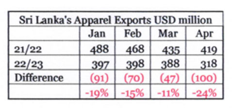 The electricity tariff hikes that came into effect at end 2022 and the beginning of this year have completely disregarded the integral role played in the country’s economy by the apparel industry. Despite continuous warnings and cautions from JAAF, the Public Utilities Commission (PUCSL) granted approval to a 66% electricity tariff hike earlier this year based on an overestimation of electricity demand. This was done having well realised that the industry was faced with a15-20% drop in orders which signalled a reduction in demand due to the ongoing global recession. The result is an exponential increase in costs to business operations, threatening the sustenance and operation of a USD 5 billion industry that braces the country’s economy. As a result, due to this reduction in exports, the sector has become less competitive. Charted below is the fall in apparel exports in the first four months of 2023, highlighting a 17% decrease over the quarter.