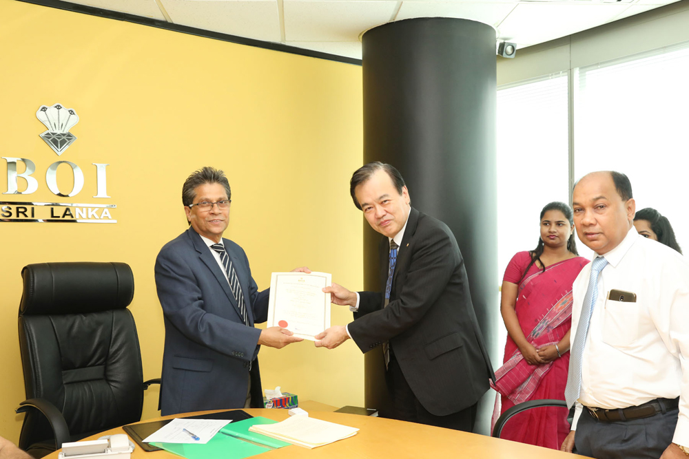 The Board of Investment of Sri Lanka signed recently a new Investment Agreement with Wakana JPN (Pvt) ltd. The Agreement was signed on behalf of the BOI by Mr. Mangala Yapa, Chairman of the BOI and on behalf of the company by Mr. Hiroyuki Ota, Director and Mr. T. G. Sunil Wickrama, Director.