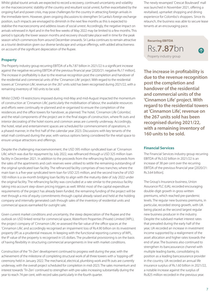 Revenue recognition at 'Cinnamon Life' commenced during the year with the completion and commencement of the handing over of the residential and commercial units. The remainder of the project is scheduled for commencement of operations, in a phased manner, in the first half of the calendar year 2023.
