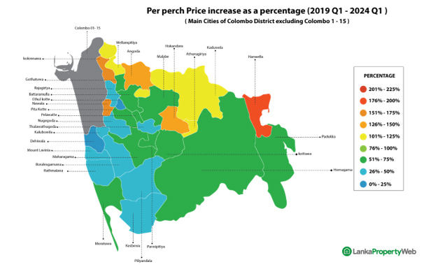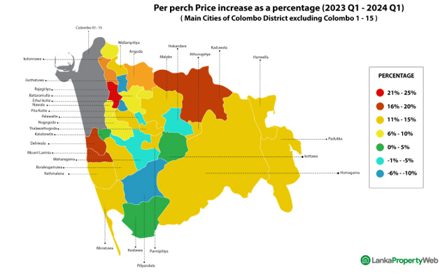 Land prices bounce back to growth in the latest Land Price Index by LankaPropertyWeb. The overall land prices in the Western Province increased by 7.8% compared to the previous year, according to the 2024 Western Province Land Price Index (LPI), developed by LankaPropertyWeb (LPW). The Land Price Index (LPI), updated annually, monitors the trends in asking price values of lands for sale across all three districts of the Western Province - Gampaha, Kalutara, and Colombo. Based on the Index findings, land prices in Gampaha District surged by 13% from the preceding year, while Kalutara witnessed an 8% rise. In the Colombo district (excluding Colombo 1-15), a growth of 8% was observed, with Colombo 1-15 explicitly marking a 2.3% increase.