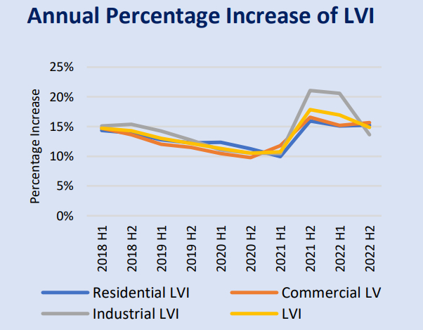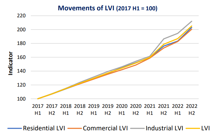 Commercial LVI recorded the highest annual increase of 15.7 per cent, followed by Residential LVI (15.2) and Industrial LVI (13.6). However, a downward trend was observed in the annual increase of LVI in second half of 2022, driven by the decline in the annual increase of Industrial LVI. Meanwhile, the annual growth of Residential and Commercial LVIs increased slightly during the second half of 2022.