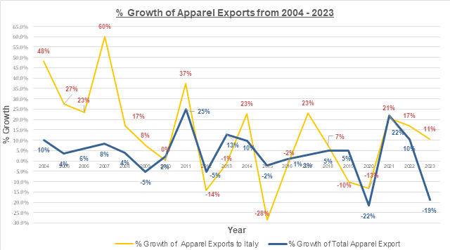 In 2013, Sri Lanka's total apparel exports were valued at US$4.3 billion, with exports to Italy accounting for 9% or US$408 million. Ten years later, Sri Lanka’s total apparel exports saw a modest 5% increase to US$4.53 billion, while exports to Italy surged 38% to US$563.5 million, accounting for nearly 12% of Sri Lanka’s total apparel exports.