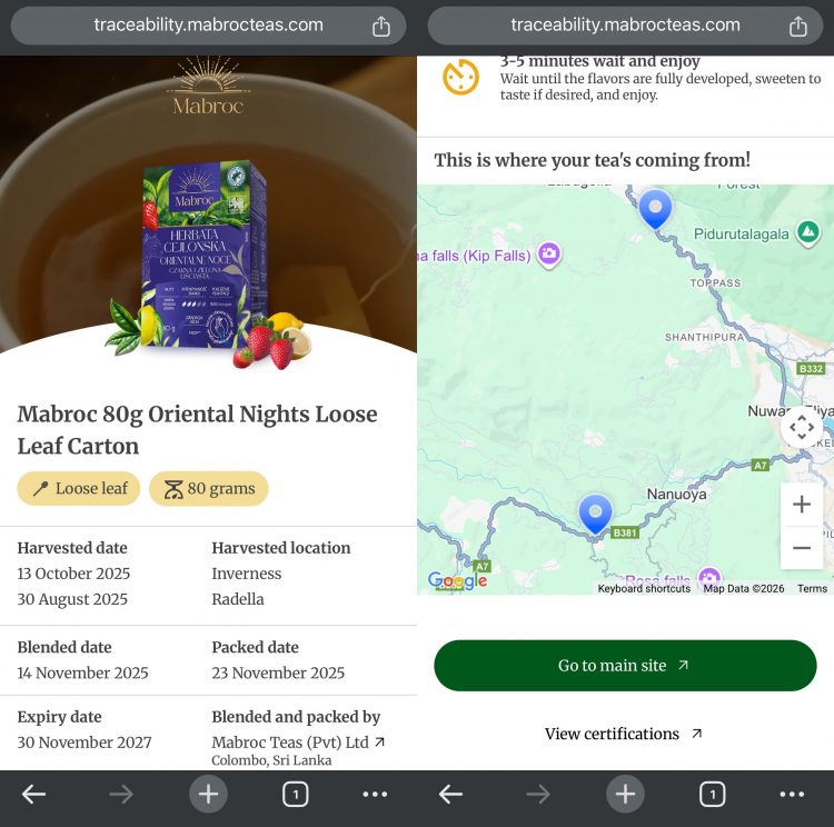 Mabroc’s TeaTrace consumer interface, providing batch-level traceability, origin mapping and certification visibility to support transparency and informed consumer choice.