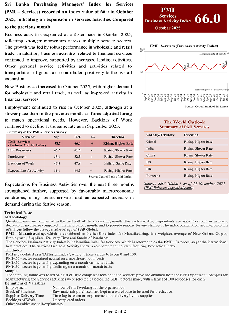 Sri Lanka Purchasing Managers’ Index for Services (PMI – Services) recorded an index value of 66.0 in October 2025, indicating an expansion in services activities compared to the previous month.