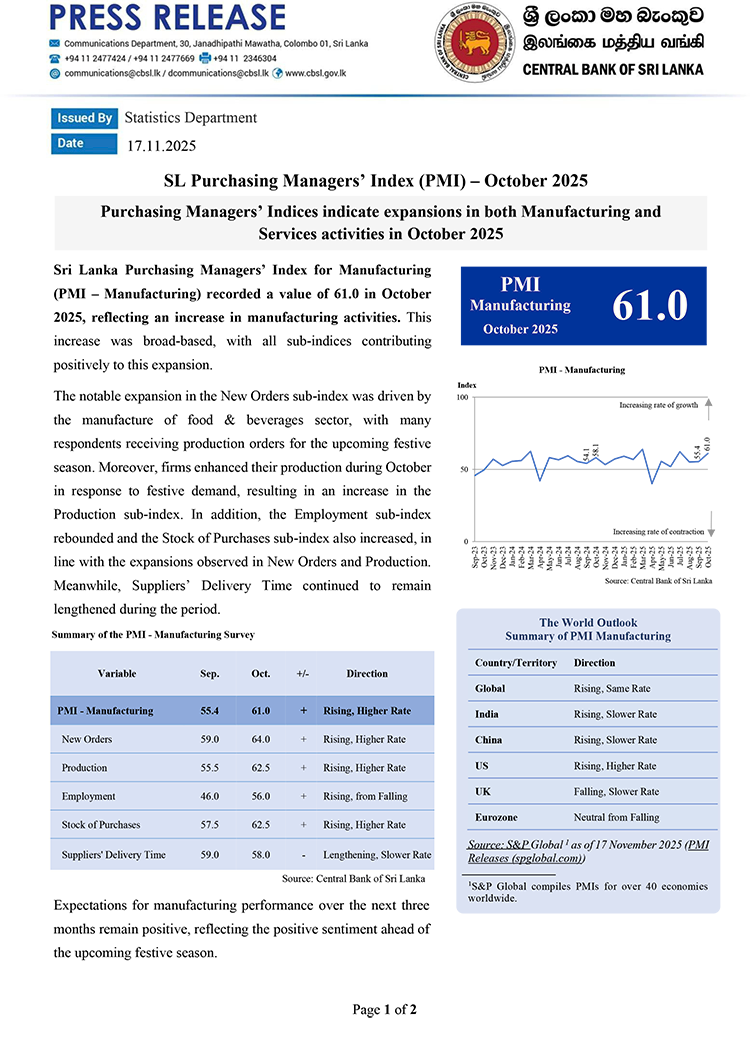 Sri Lanka Purchasing Managers’ Index for Manufacturing (PMI – Manufacturing) recorded a value of 61.0 in October 2025, reflecting an increase in manufacturing activities. This increase was broad-based, with all sub-indices contributing positively to this expansion.