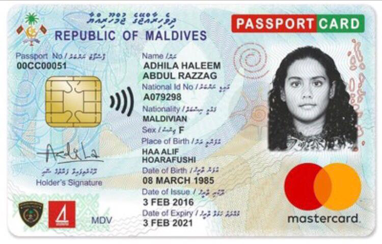 Maldives Passport card is a Mastercard Biometric Debit Card issued by the Bank of Maldives. It is a Dual Interface Chip card with additional features and applications. It is the first Payment card in the World by a network which has Passport, National ID and Driving license of the cardholder in one plastic card. The Mastercard Passport Card can be used for a wide range of purposes/services. Primarily the Passport Card is an identity travel document complying with the ICAO data standards allowing it to be used at e-gates at the Maldives International Airport. Additionally, it can be used for identity verification by law enforcement agencies. It can also be used to provide government services such as medical services and other e-services.