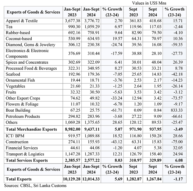 Earnings from export of Apparel, Tea, Rubber products, Coconut products and Spices & Concentrates increased by 2.7 %, 6.97 %, 9.64 %, 19.57 % and 6.41 % respectively during the first nine months of 2024 in comparison to the corresponding period of 2023.