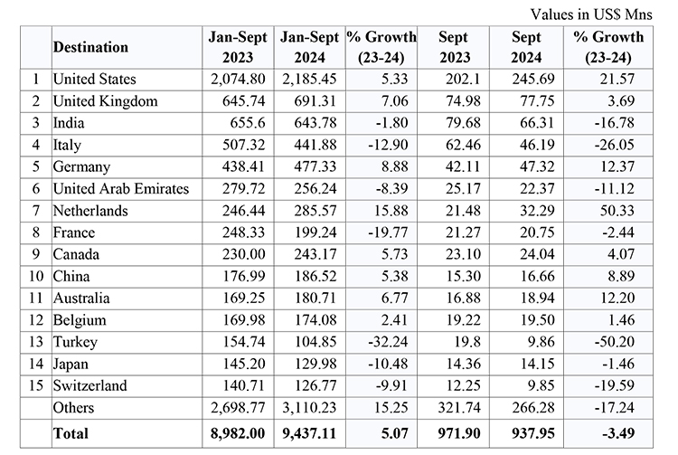 Exports to the top five EU markets were recorded as; Germany US$ 477.33 Mn (increased by 8.88 %), Italy US$ 441.88 Mn (decreased by 12.9 %), Netherlands US$ 285.57 Mn (increased by 15.88 %), France US$ 199.24 Mn. (decreased 19.77 %) and Belgium US$ 174.08 Mn (increased by 2.41%) during the cumulative period of January to September 2024 in comparison to the corresponding period in 2023.