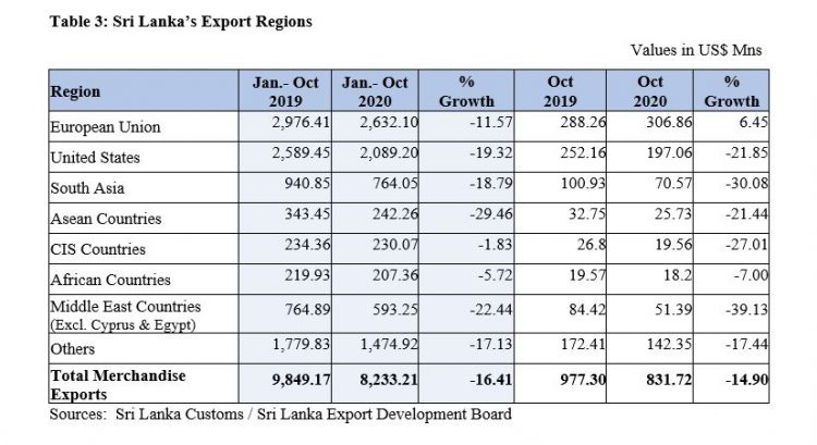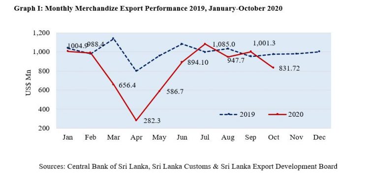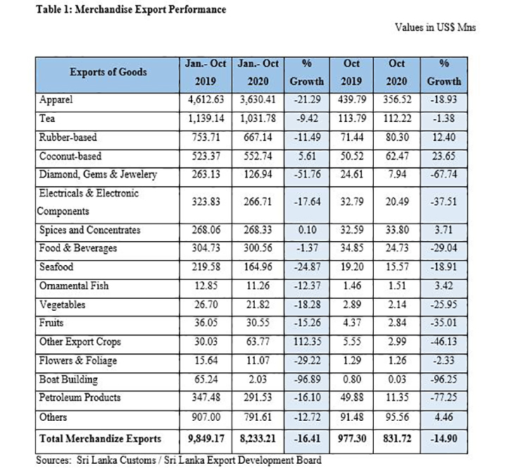 Total merchandize export earnings for January to October 2020 was US$ 8,233.21 Mn compared to US $ 9,849.17 Mn recorded in a similar period of the previous year – a decline of 16.41 %.