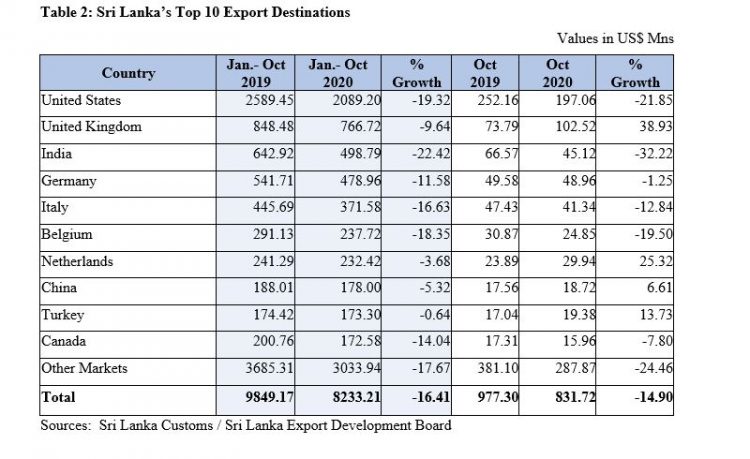 Major exports such as Apparel & Textiles (US$ 3,630.41 Mn), Tea (US$ 1,031.78 Mn), Rubber & Rubber based products (US$ 667.14 Mn) and Electrical & Electronic Components (US$ 266.71 Mn) recorded decrease of 21.29%, 9.42%, 11.49% and 17.64% respectively during January - October 2020 compared to the similar period of previous year.
