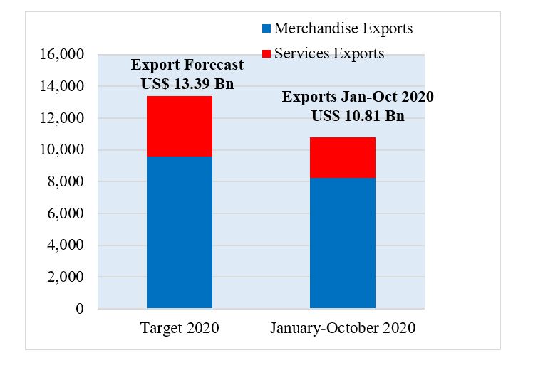 The revised export target of the Export Development Board for 2020 is US$ 13.39 billion and of that we expect US$ 9.57 billion from merchandise exports and US$ 3.82 billion from services exports. During the period January to October 2020, earnings from exports recorded US$ 10.81 billion including the estimated services data for July to October and 80.75% achieved from the revised export target.