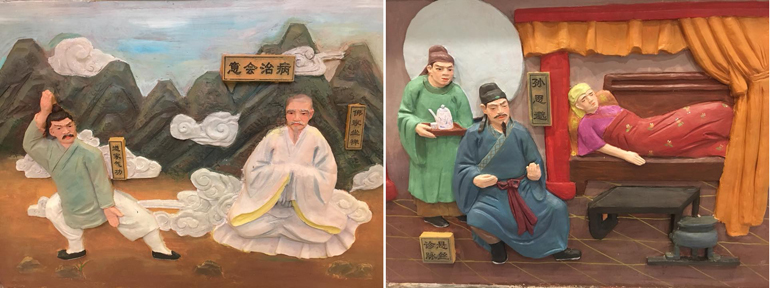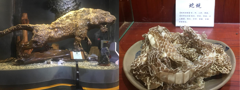 Photo caption: (Above) Outside the Jinning elders’ facility and (below) exhibits at the Yunnan museum for ancient Chinese remedies