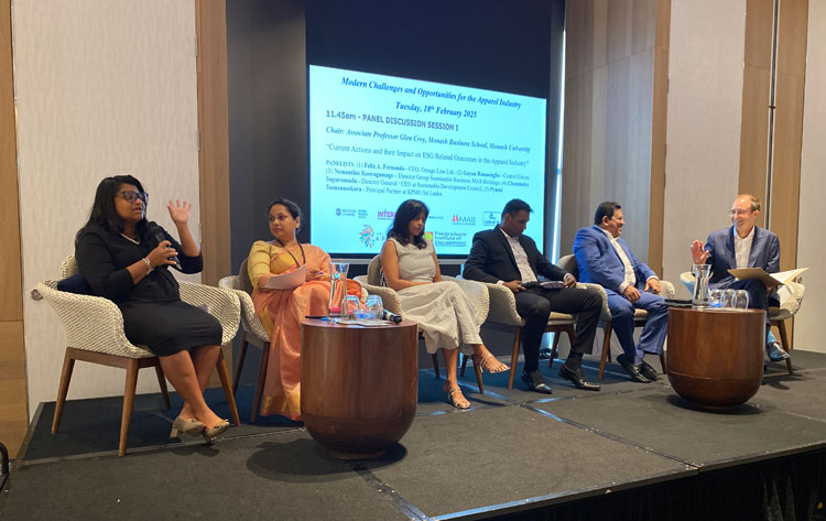 (Left to right) Panelists, Pyumi Sumanasekara – Principal Partner, KPMG Sri Lanka, Chamindry Saparamadu – Director General/CEO, Sustainable Development Council, Nemanthie Kooragamage – Director Group Sustainable Business, MAS Holdings, Gayan Ranasinghe – Control Union & Felix A. Fernando – CEO, Omega Line Ltd chaired by Associate Professor Glen Croy, Monash Business School, Monash University