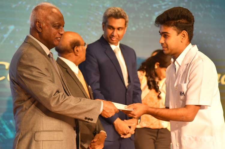 Chairman of Nawaloka Hospitals Group Deshamanya, Dr. Jayantha Dharmadasa recognizing a long-standing employee in Nawaloka Hospitals