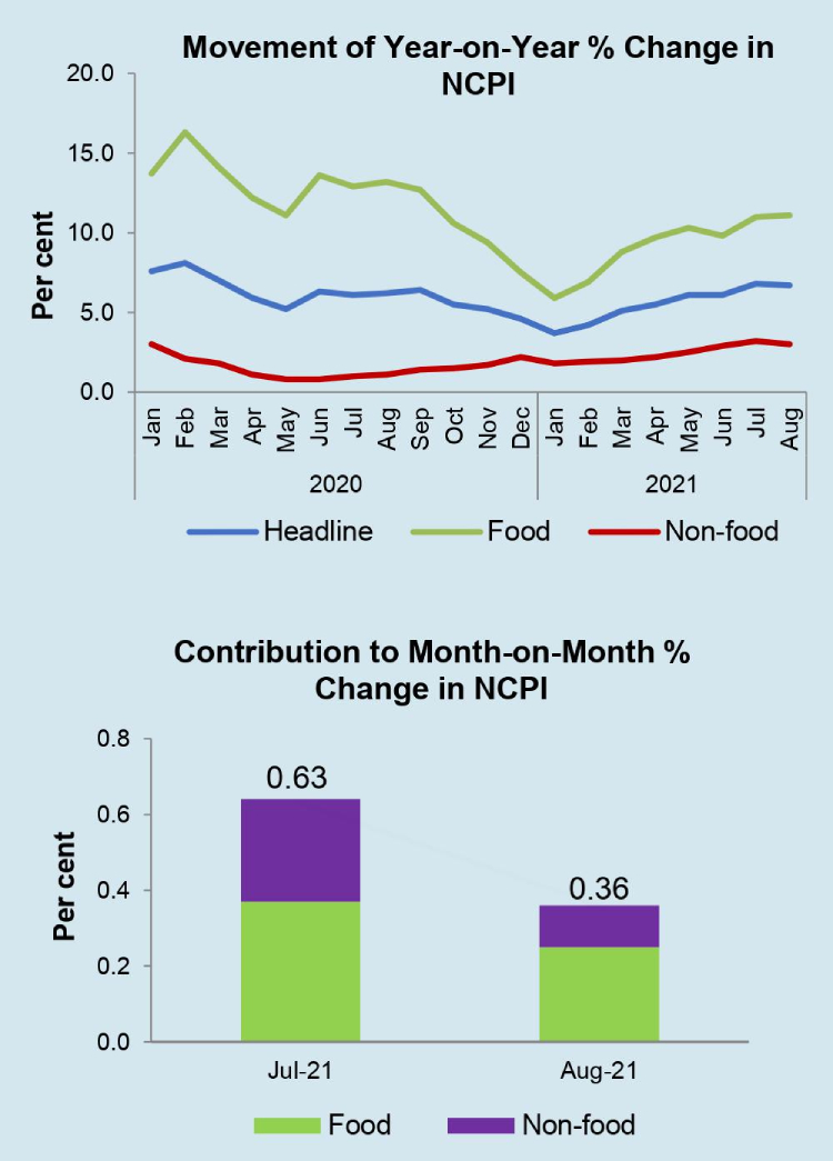 The NCPI, measured on an annual average basis, increased marginally to 5.5 per cent in August 2021 from at 5.4 per cent in July 2021.