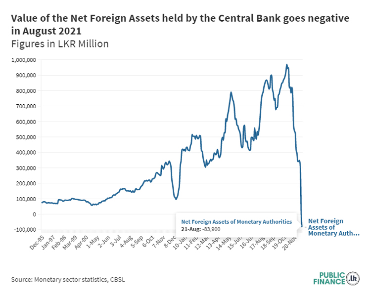 PublicFinance.lk - Net Foreign Assets (NFA) of a country's monetary authority refers to the difference between gross foreign reserve assets and liabilities related to foreign reserves. Typically, such liabilities include the Central Bank's liabilities to the IMF, swaps, and any other reserve related liabilities. In August 2021 the Central Bank's NFA was LKR –84 billion. The Central Bank has published data on CBSL NFA since 1995 and this is the first time the CBSL's NFA has turned negative during this period.