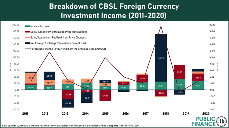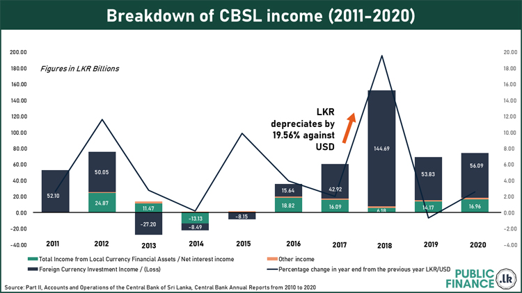 It is evident from this infographic that forex revaluation gains on the CB's foreign assets have a significant impact on annual profit of the institution. Whenever the Sri Lankan rupee depreciates, the resulting revaluation of foreign assets translated into Sri Lankan rupees has a positive impact on the Central Bank’s income statement. For instance, in 2018, when there was a sharp depreciation of the currency, there was a substantial exchange gain in the CBSL income statement that year. However, given the recent downturn in the NFA position of CBSL, this is likely to have an adverse impact on Central Bank income statement going forward even if the currency continues to depreciate.