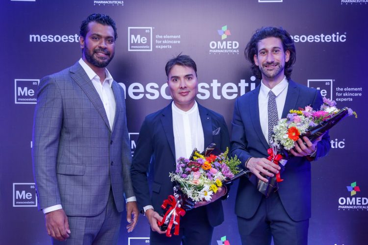 Image caption : Mesoestetic 1: OMED Pharmaceuticals Chairman Shervin Mario Lindsay, Mesoestetic Pharma Group International Speaker Dr. Gabriel Ayala Velazquez and Regional Export Manager - South Asia and Middle East Joan Ramon Navarro