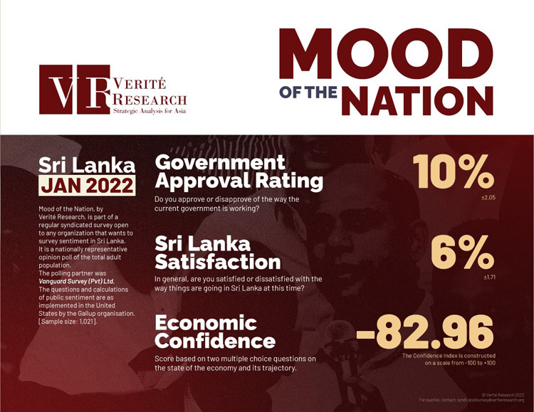 The poll is based on an island wide nationally representative sample of responses from 1,021 Sri Lankan adults, conducted in January 2022. The sample and methodology were designed to ensure a maximum error margin of under 3% at a 95% confidence interval. The polling partner was Vanguard Survey (Pvt) Ltd.