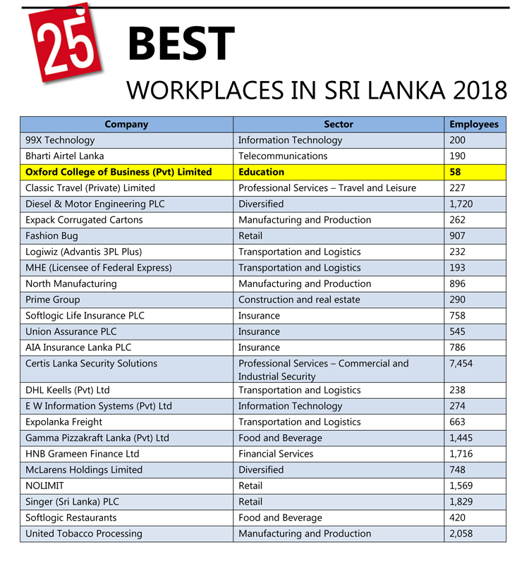 Oxford College of Business has received yet another accolade which lays claim to its fame among its employees. Oxford College of Business became the only educational provider in Sri Lanka to be among the Top 25 best organizations in the “Great Place to Work,” listing for the 5th consecutive year by Great Place to Work Institute in partnership with The Ceylon Chamber of Commerce and LMD.