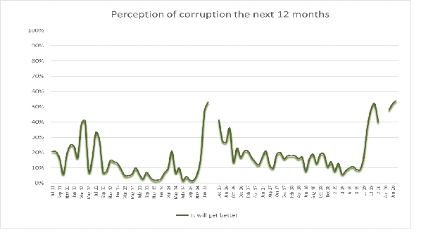 As was the case in January 2015 presidential election the public in general expected corruption to fall. The figure rose to 52 percent in January but by February 2020 this expectation had fallen to 40 percent. However, in a very positive turn of events the perceptions turn around again and the number who expected corruption to fall increased to a 10-year high of 54 percent. If this was a result of the way in which the government carried out its tasks during the lock-down or if it was due to the involvement of the military to carry out the general government functions to ensure peoples safety without the usual petty corruption we shall see in the coming months as functions gradually move back to the normal procedures.