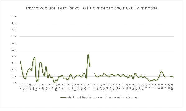 Having obtained their views on cost of living and ability to save some of what they earn, we ask the respondents on their perceptions on their personal savings in the coming 12 months. The perception on the public’s ability to save a ‘little more’ than what they do at present increased after the election of the new President but soon dissipated by February 2020. The perceptions remained at the same low levels in May, June and July at around 10 percent. This finding is consistent with that of the earlier on the hope for opportunities. By and large people are ‘very worried’ about the future and resigned to the fact their lives will not get any better anytime soon.