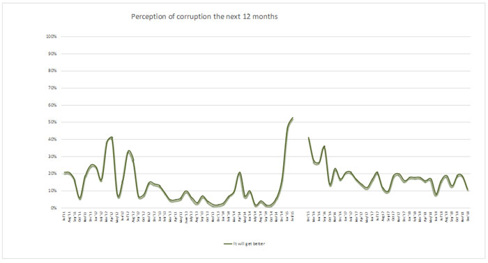 The expectation for reduction of corruption in the country showed a significant gradual decrease in the fourth quarter of 2018 compared to the increasing trend in the third quarter. The instability of the political situation in the country may have affected the decease.