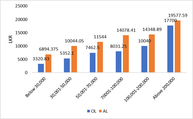 The surge in the cost of living with wages failing to keep pace with inflation and loss of income generation channels have been unbearable for parents of school-going children. The IPS study found that students who belonged to family income levels below LKR 30,000 spend approximately LKR 3,000-Rs. 7,000 per month while students whose family income was above LKR 200,000 spend approximately LKR 18,000- LKR 20,000 per month on private tuition depending on the grade of the student. This scenario is illustrated in Figure 1.
