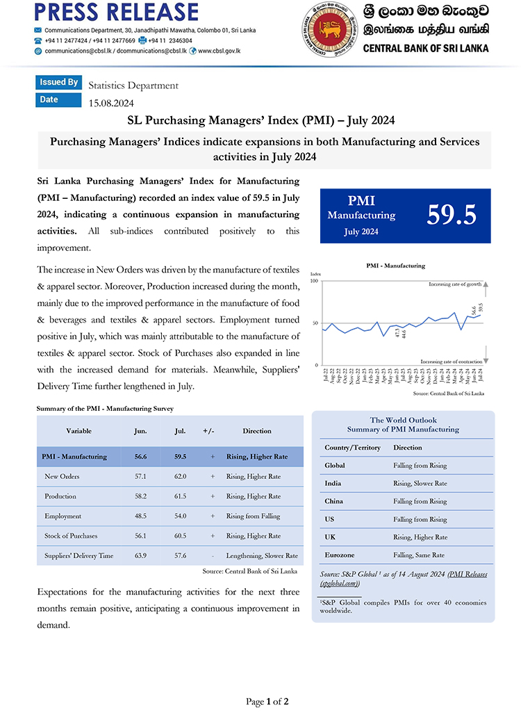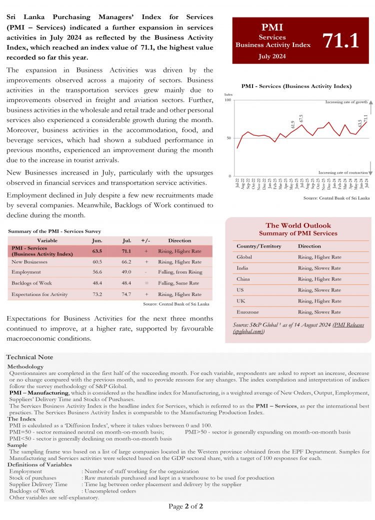 Sri Lanka Purchasing Managers’ Index for Services (PMI – Services) indicated a further expansion in services activities in July 2024 as reflected by the Business Activity Index, which reached an index value of 71.1, the highest value recorded so far this year.