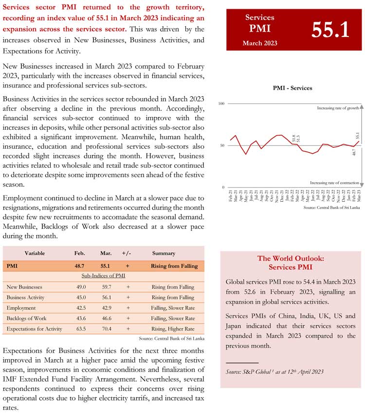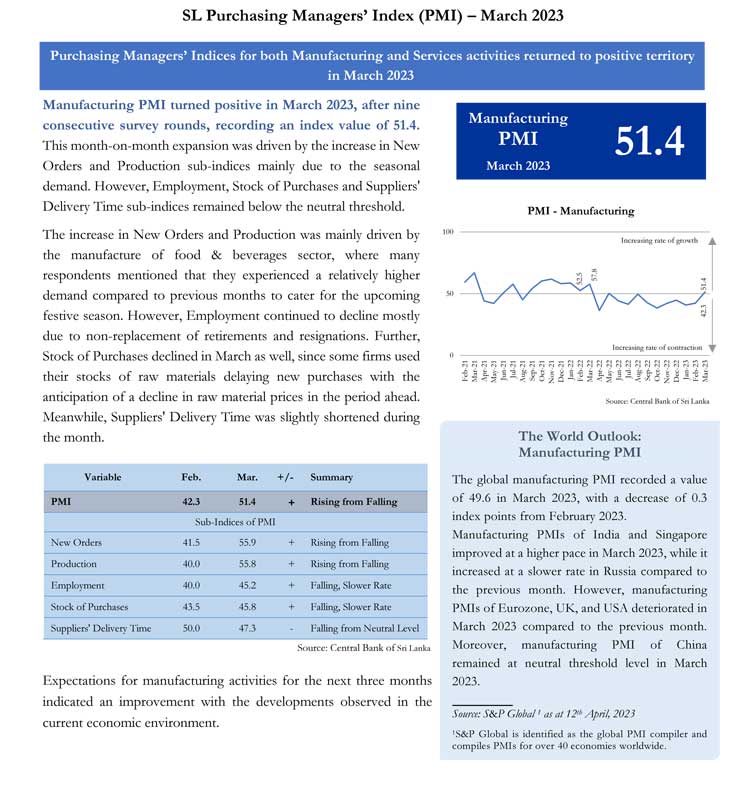 The increase in New Orders and Production was mainly driven by the manufacture of food & beverages sector, where many respondents mentioned that they experienced a relatively higher demand compared to previous months to cater for the upcoming festive season. However, Employment continued to decline mostly due to non-replacement of retirements and resignations. Further, Stock of Purchases declined in March as well, since some firms used their stocks of raw materials delaying new purchases with the anticipation of a decline in raw material prices in the period ahead. Meanwhile, Suppliers' Delivery Time was slightly shortened during the month.