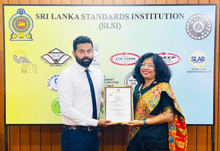 Picture Caption : Mr Azeem Omer. (HOD Quality Assurance) receiving the ISO 9001:2015 certifications from Dr. (Mrs.) Siddhika G. Senaratne (Director General-SLSI)