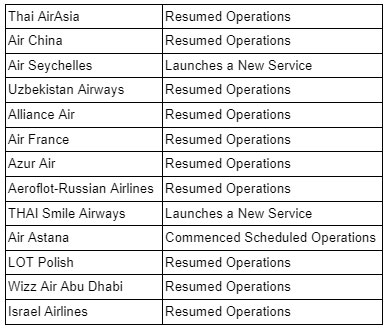 Airlines that have recently resumed operations, launched new services, or commenced scheduled operations