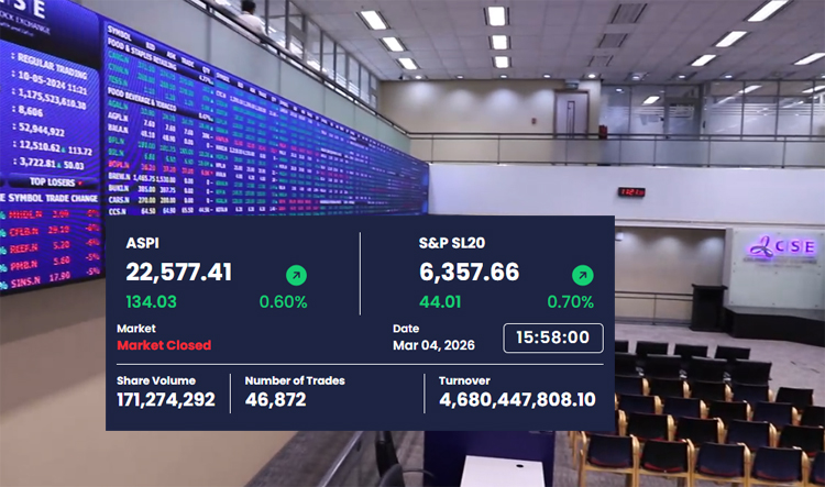 The All Share Price Index (ASPI) gained 134.03 points to close at 22,577.41 at the end of trading, while the S&P SL20 Index advanced by 44.01 points to settle at 6,357.66.