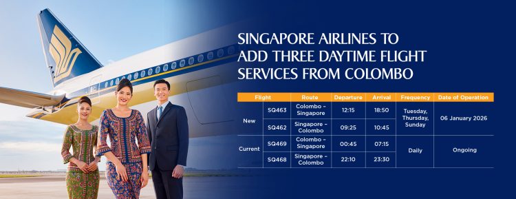 Singapore Airlines will commence three daytime flight services between Colombo and Singapore from 6 January 2026, further expanding connectivity between Sri Lanka and the airline’s global network.