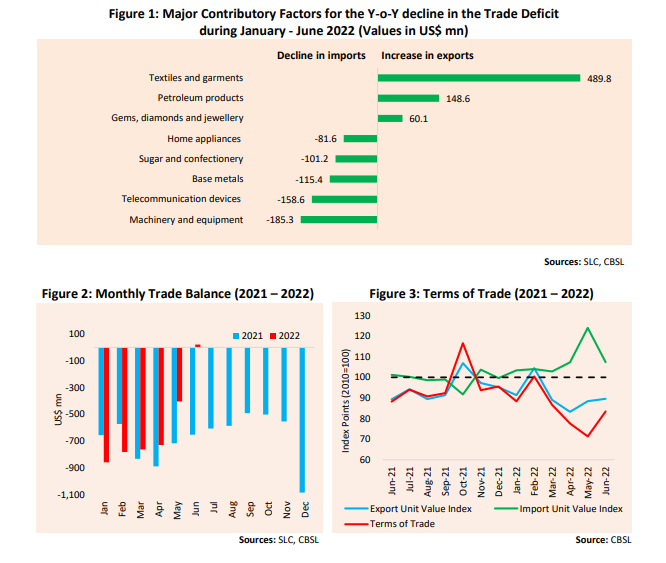 Trade Balance: The balance in the merchandise trade account in June 2022 recorded a surplus of US dollars 21 million, compared to the deficit of US dollars 652 million recorded in June 2021, and for the first time since August 2002, where a trade surplus of US dollars 110 million was recorded. Meanwhile, the cumulative deficit in the trade account during January-June 2022 narrowed to US dollars 3,514 million from US dollars 4,316 million recorded over the same period in 2021. The major contributory factors for the decline in the cumulative trade deficit are shown in Figure 1.