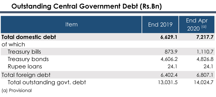 The total outstanding central government debt has increased from Rs 13,031.5 billion to Rs 14,024.7 billion during the first four months of 2020, the latest weekly report by the Central Bank of Sri Lanka (CBSL) outlines.