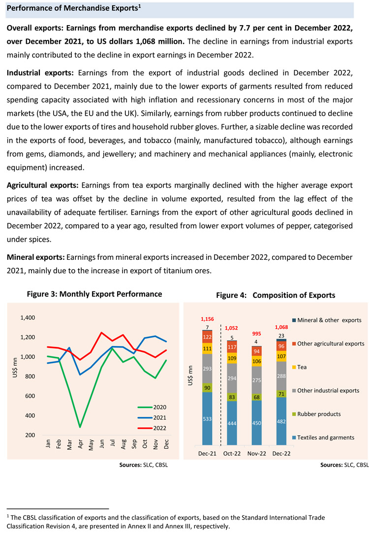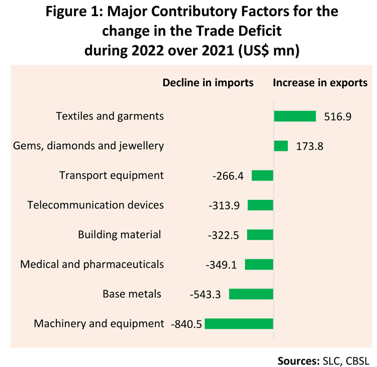 This improvement was a result of increased earnings from industrial exports, including garments, gems, diamonds and jewellery, machinery and mechanical appliances and petroleum products. Meanwhile, total import expenditure in 2022 amounted to US dollars 18,291 million, recording a decline of 11.4 per cent, year-on-year, resulted from measures to restrict non-urgent imports and liquidity constraints prevailed in the market for the most part of 2022. As a result, the deficit in the trade account in 2022 narrowed to the lowest level since 2010 to US dollars 5,185 million, from US dollars 8,139 million recorded in 2021.