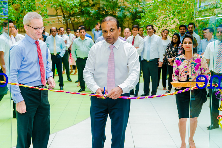 Image of Mr. Ashok Pathirage – Chairman, Softlogic Holdings PLC cutting the ribbon to unveil Softlogic GLOMARK Essentials at Asiri Hospitals while Mr. Andrew Dalby – CEO, Softlogic Supermarket looks on.