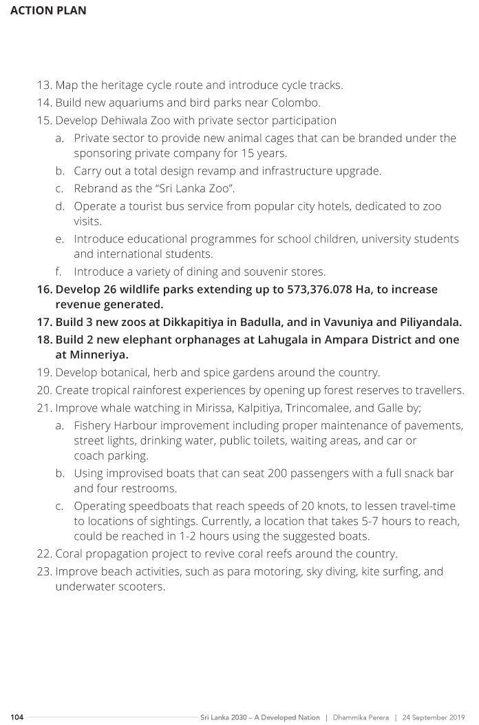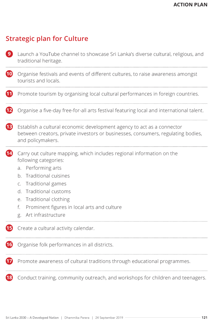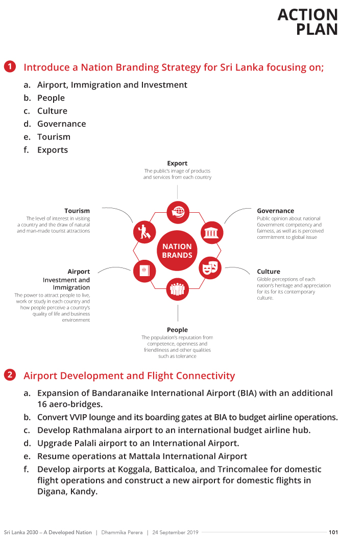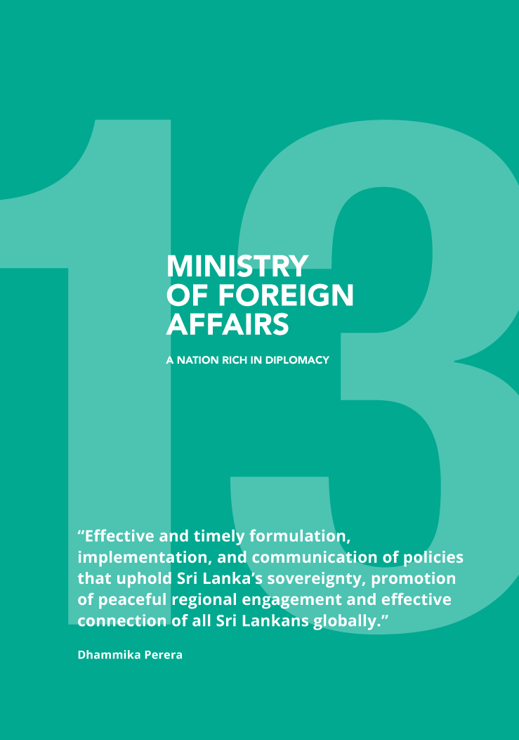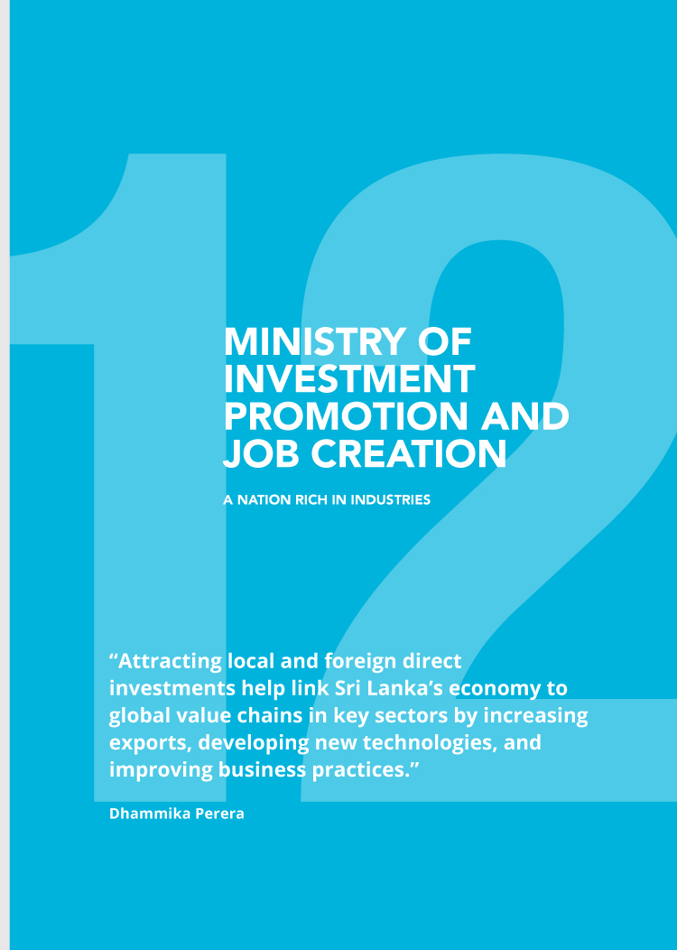 The Economic Growth Strategy, presented by Perera showcases a sustainable development of the Sri Lankan economy via 21 ministries comprising; Finance and Planning, Education, Higher Education, Technical, Vocational Education and Training, Social Development, Regional Development, Agriculture and Agro Based Industry, Investment Promotion and Job Creation, Transport and Civil Aviation, Ports and Shipping, Tourism, Power and Energy, Information and Communication Technology, Health, Environment and Natural Resources, National Security, Foreign Affairs, Youth and Sports, Religious Affairs and Interfaith Harmony, and Arts and Culture.